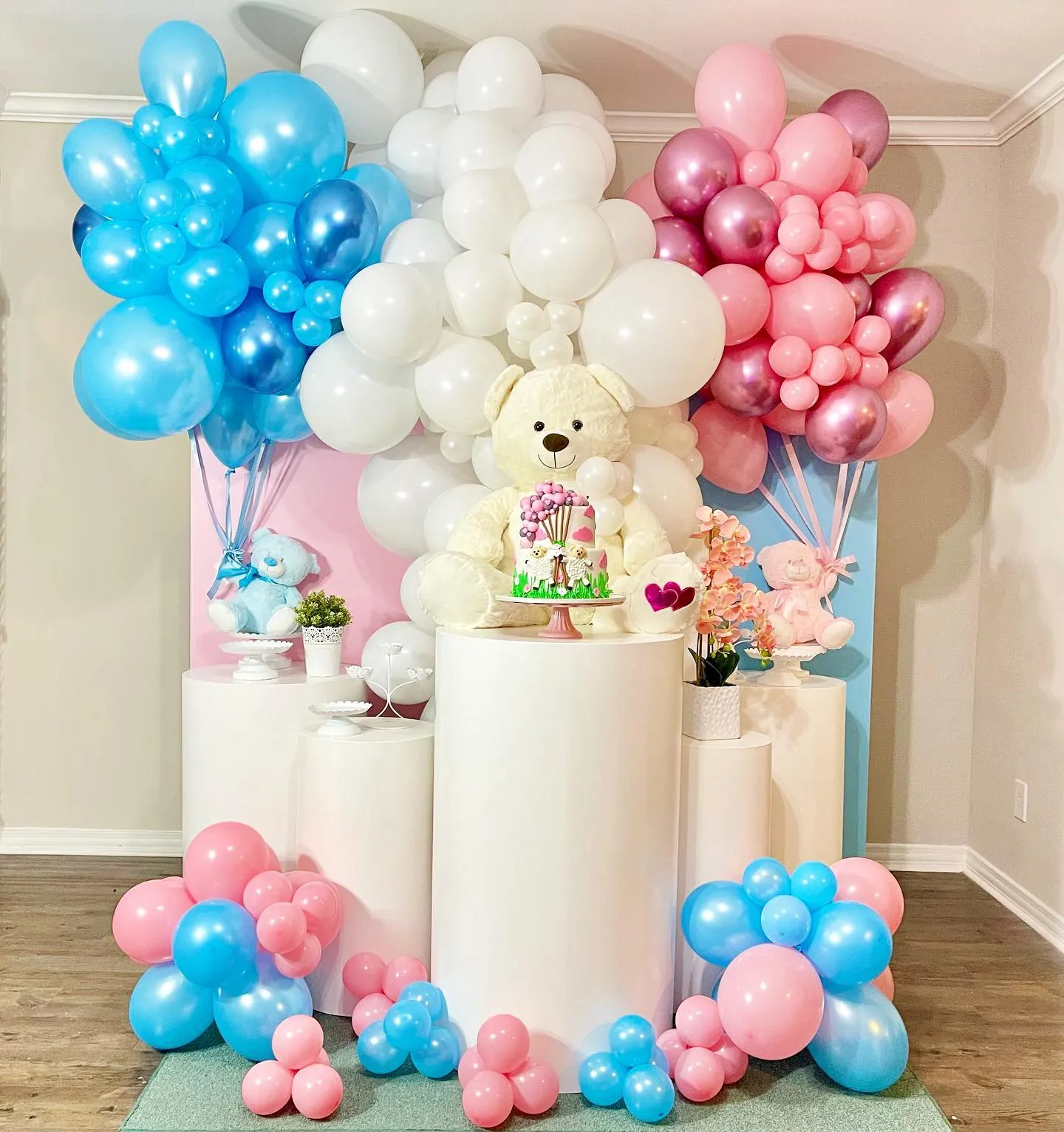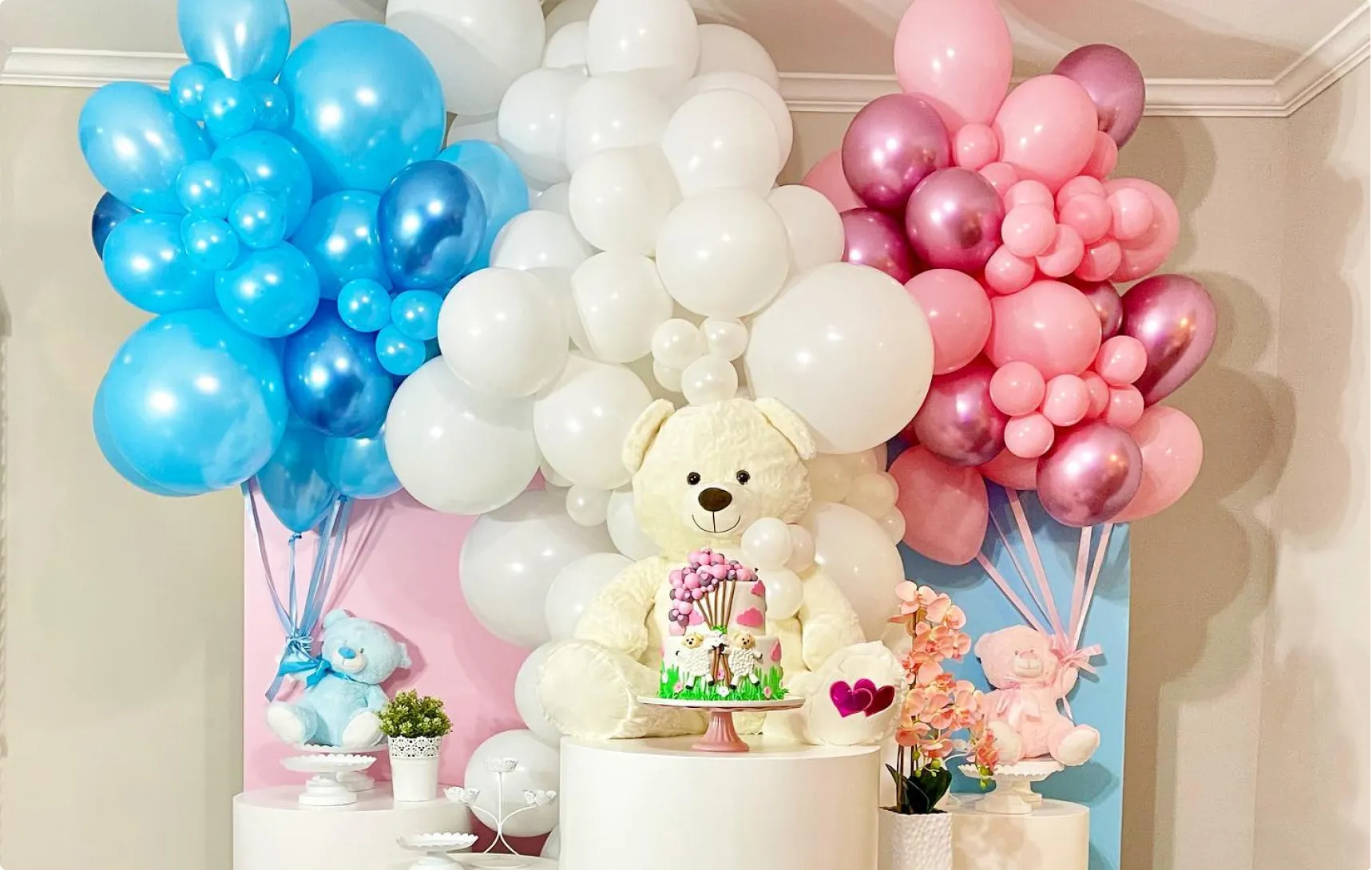 Gender reveal balloon decoration options are varied and include giant balloons filled with pink or blue confetti, smaller balloons with printed messages, personalized balloons with the baby’s name, and balloon decorations in the shape of letters or numbers. Everything depends on your tastes and preferences.